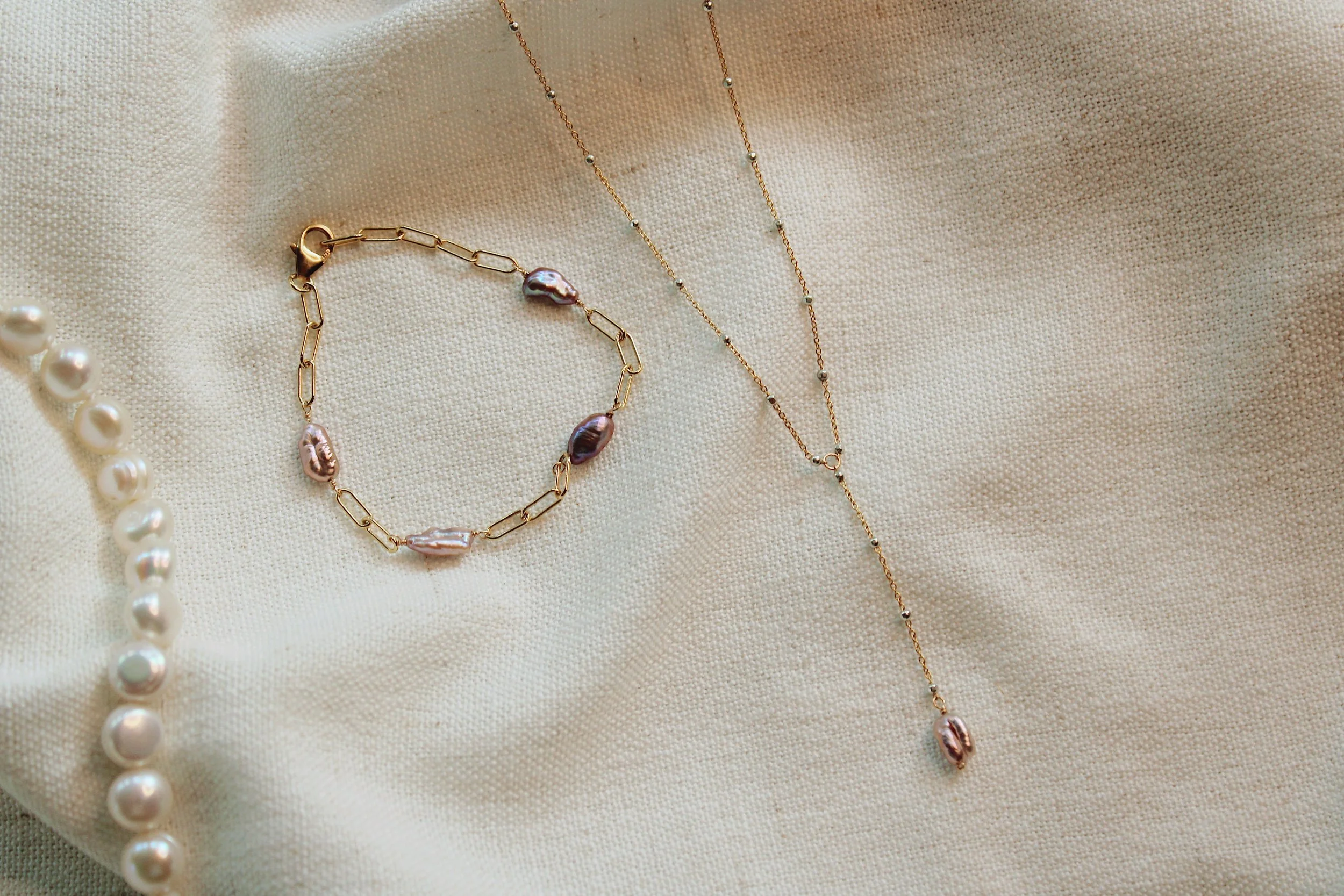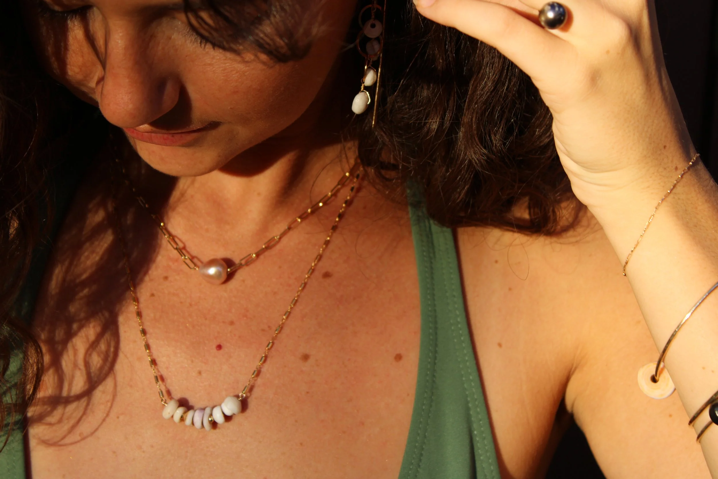 Puka shell and Edison Freshwater Pearl on a 14K Gold-filled bar-chain.